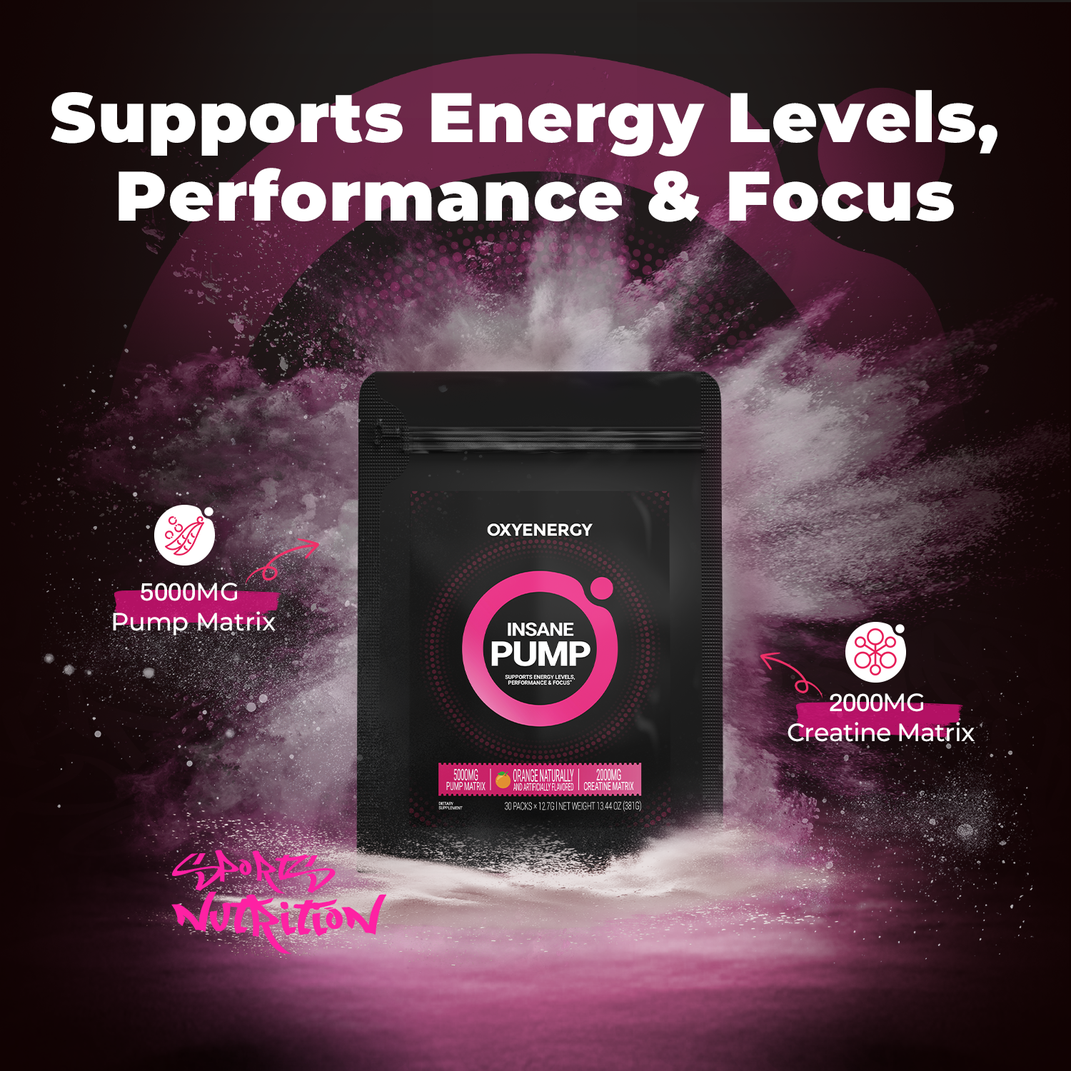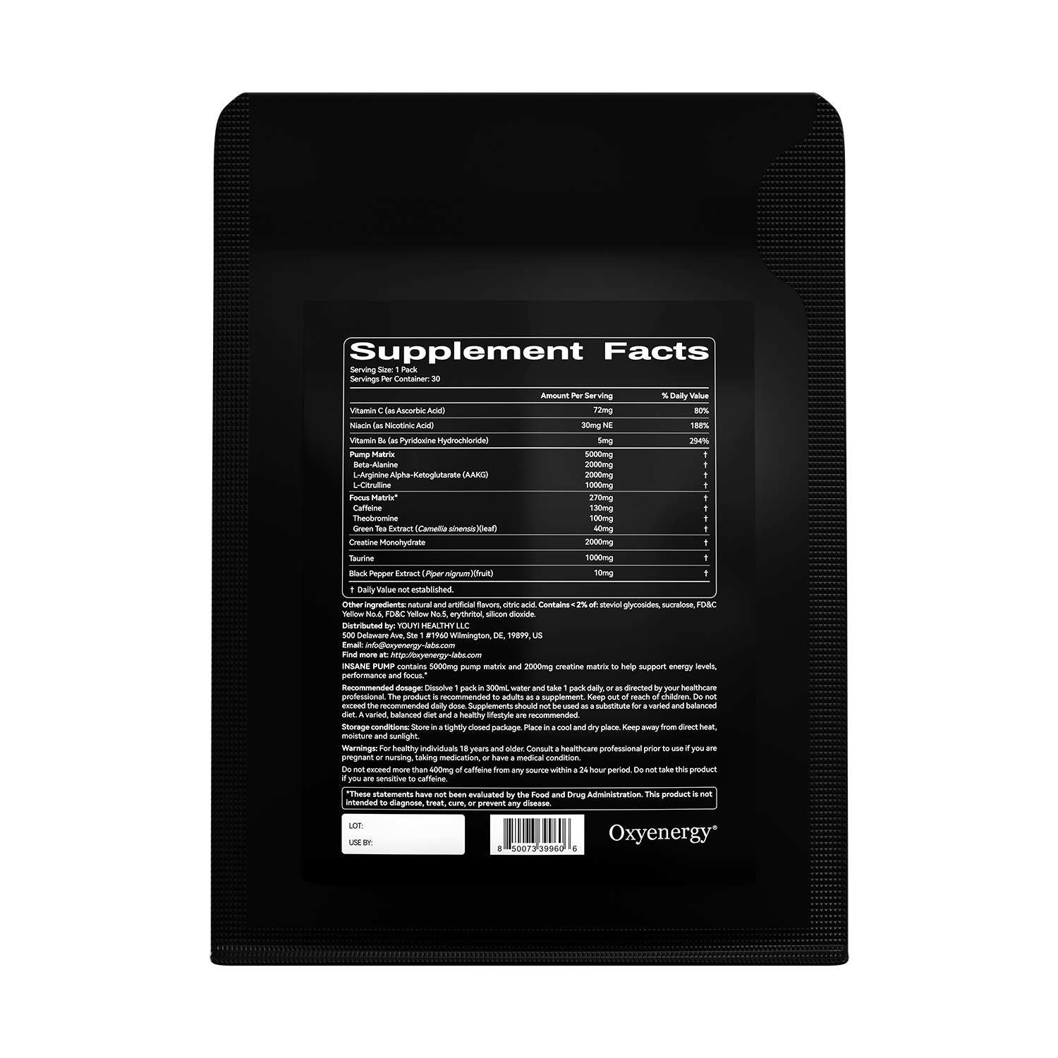 INSANE PUMP contains 5000mg pump matrix and 2000mg creatine matrix to help support energy levels, performance and focus.