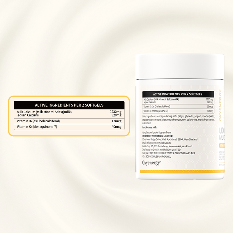 LIQUID MILK CALCIUM are a high-absorption calcium supplement designed for individuals over 3 years old who need extra calcium. Each capsule contains 1230mg of milk calcium, combined with Vitamin D3 and VK2, to enhance calcium absorption and utilization. With a great taste, it's suitable for the whole family.